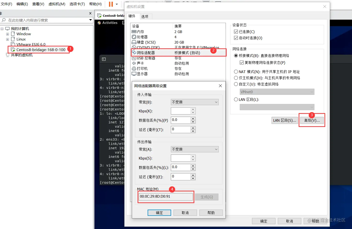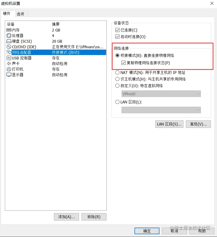 【注意】这里需要注意一点的就是虚拟交换机必须桥接到本机电脑使用的网卡,不要选自动,要不然很容易桥接到其它网卡上导致上不了网。还有就是配置虚拟机网卡时虚拟机的ip跟本机同一个网段,网关一样。
