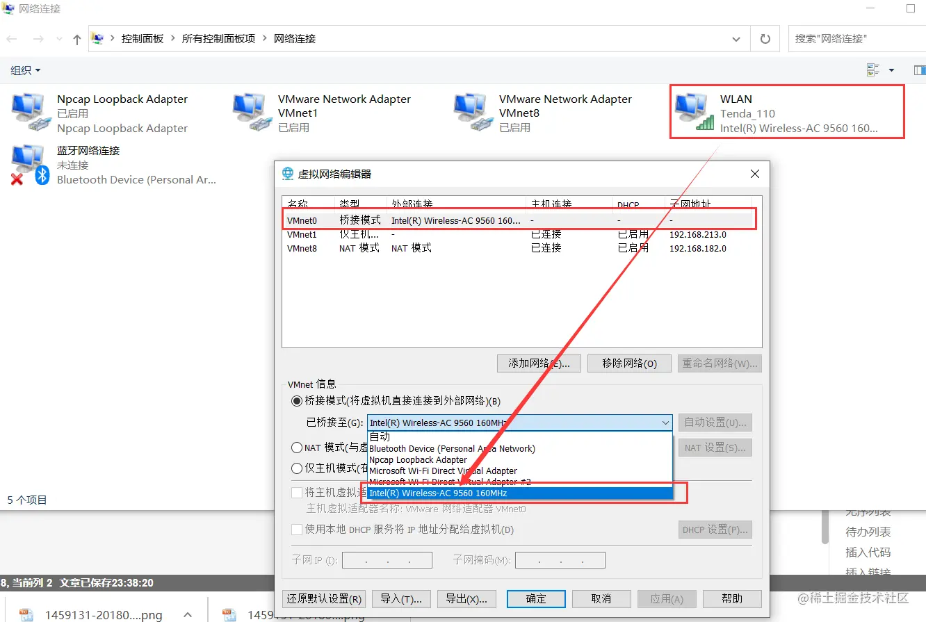2) 桥接网卡“编辑”-》“虚拟网络编辑器”-》“更改设置”,设置完后【确认】就行了