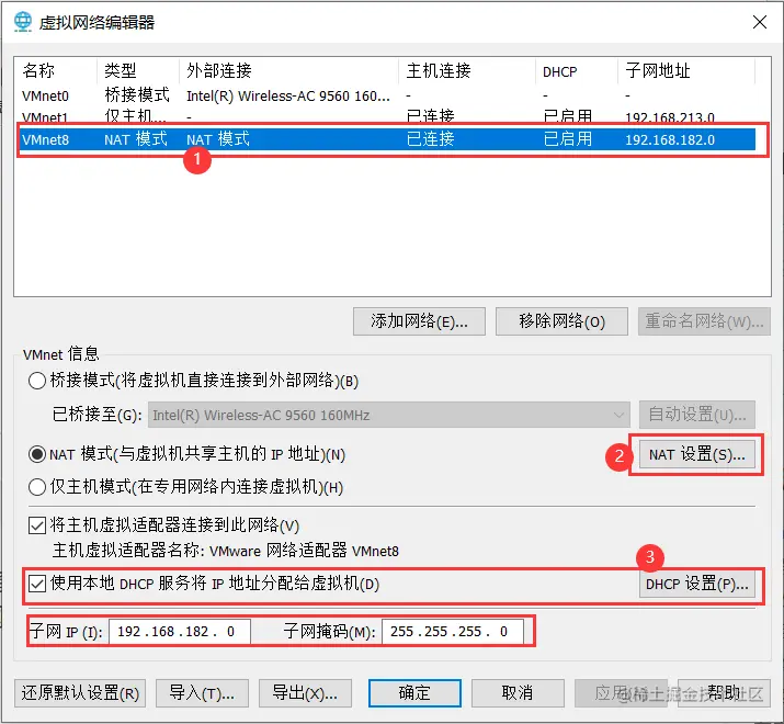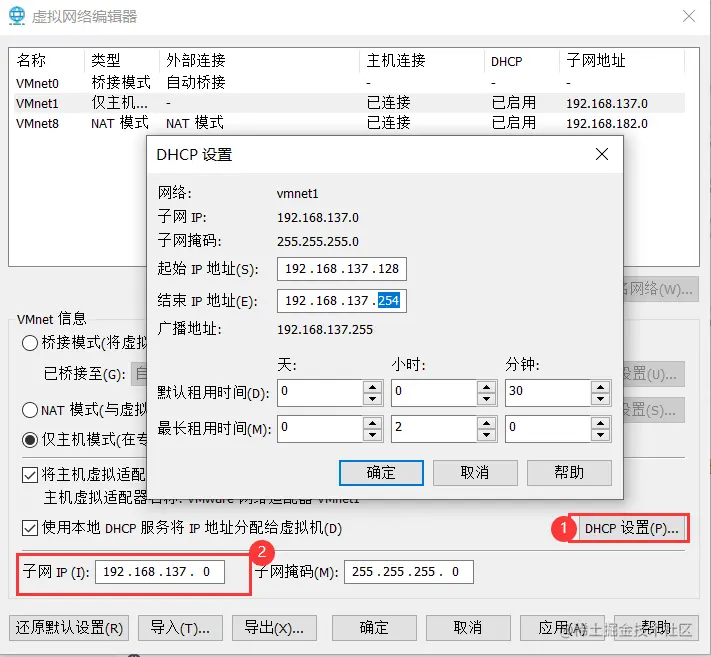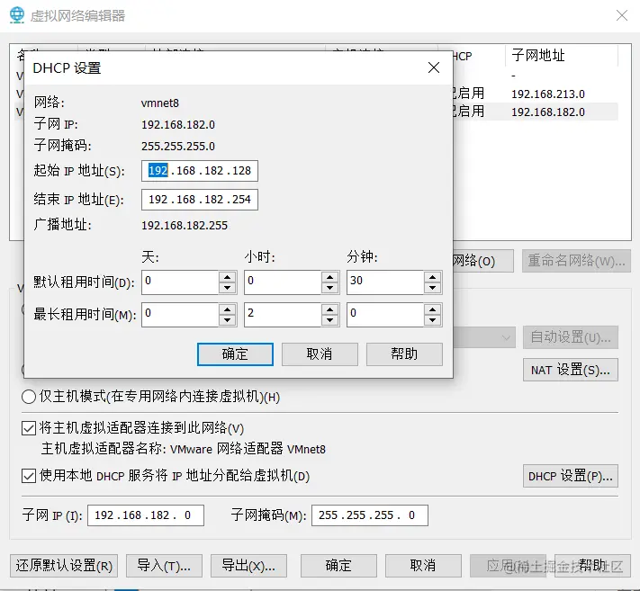 2)查看/设置虚拟网卡适配器的ip,DHCP;【编辑】-》【虚拟网络编辑器】-》【更改设置】