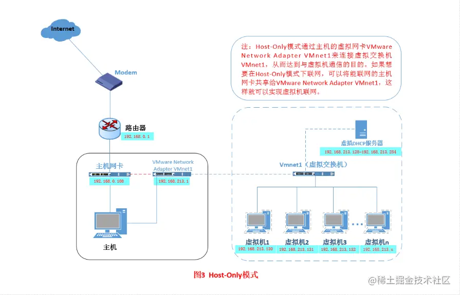 Host-Only模式其实就是NAT模式去除了虚拟NAT设备,然后使用VMware Network Adapter VMnet1虚拟网卡连接VMnet1虚拟交换机来与虚拟机通信的,Host-Only模式将虚拟机与外网隔开,使得虚拟机成为一个独立的系统,只与主机相互通讯。其网络结构如下图所示: