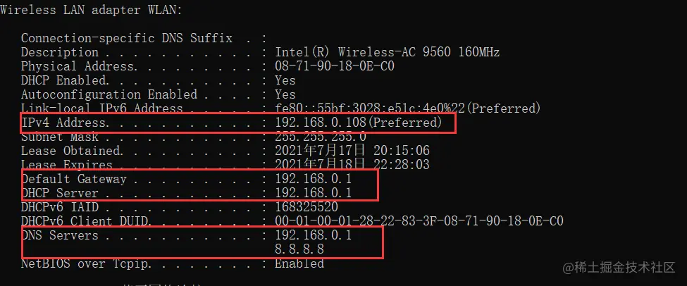 3)查看本机ip,dhcp,dns和网关ipconfig /all