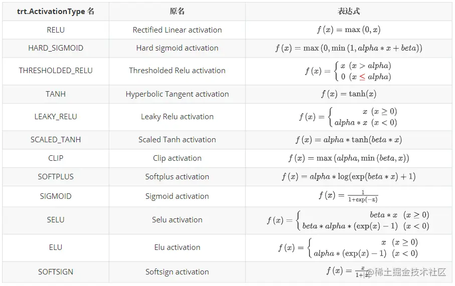 TensorRT Activation 有丰富的内置的激活函数可直接调用,可以通过 trt.ActivationType 进行查看支持的激活函数,如下: