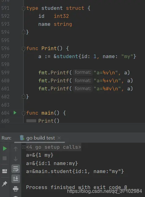 Go 格式化输出 %v、%+v、%#v 的区别 梦 2022-06-24 196 阅读1分钟 本文已参与「新人创作礼」活动, 一起开启掘金创作之路。 参考:大佬文章 1. %v 只输出所有的值 2. %+v 先输出字段类型,再输出该字段的值 3. %#v 先输出结构体名字值,再输出结构体(字段类型+字段的值)