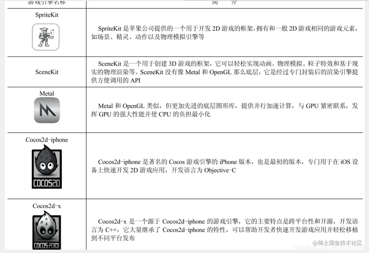目前苹果公司提供的游戏引擎有3个:用于2D游戏开发的SpriteKit框架、用于3D游戏开发的SceneKit框架和底层的游戏图形库Metal。