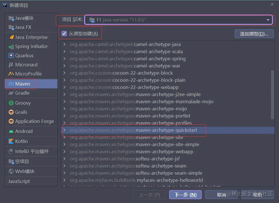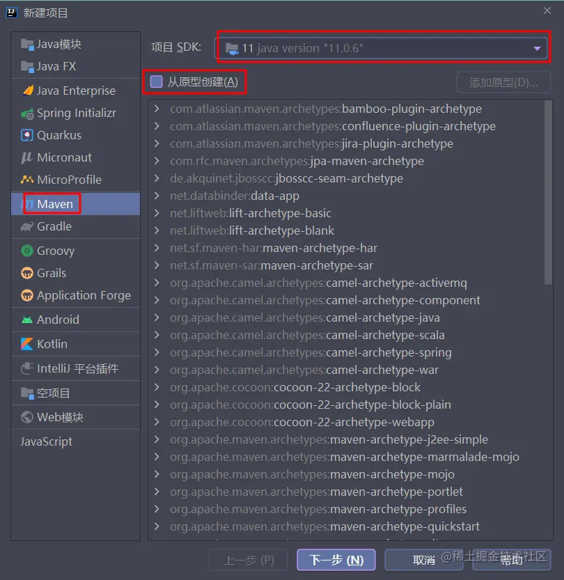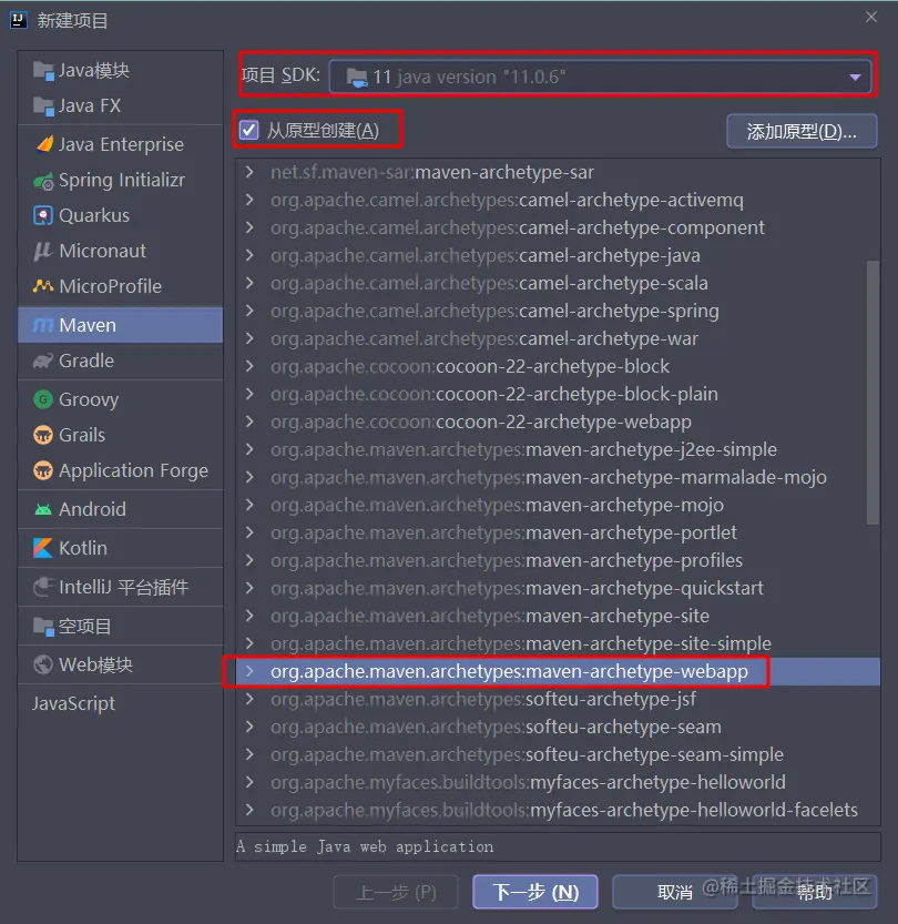 - 创建项目,选择骨架