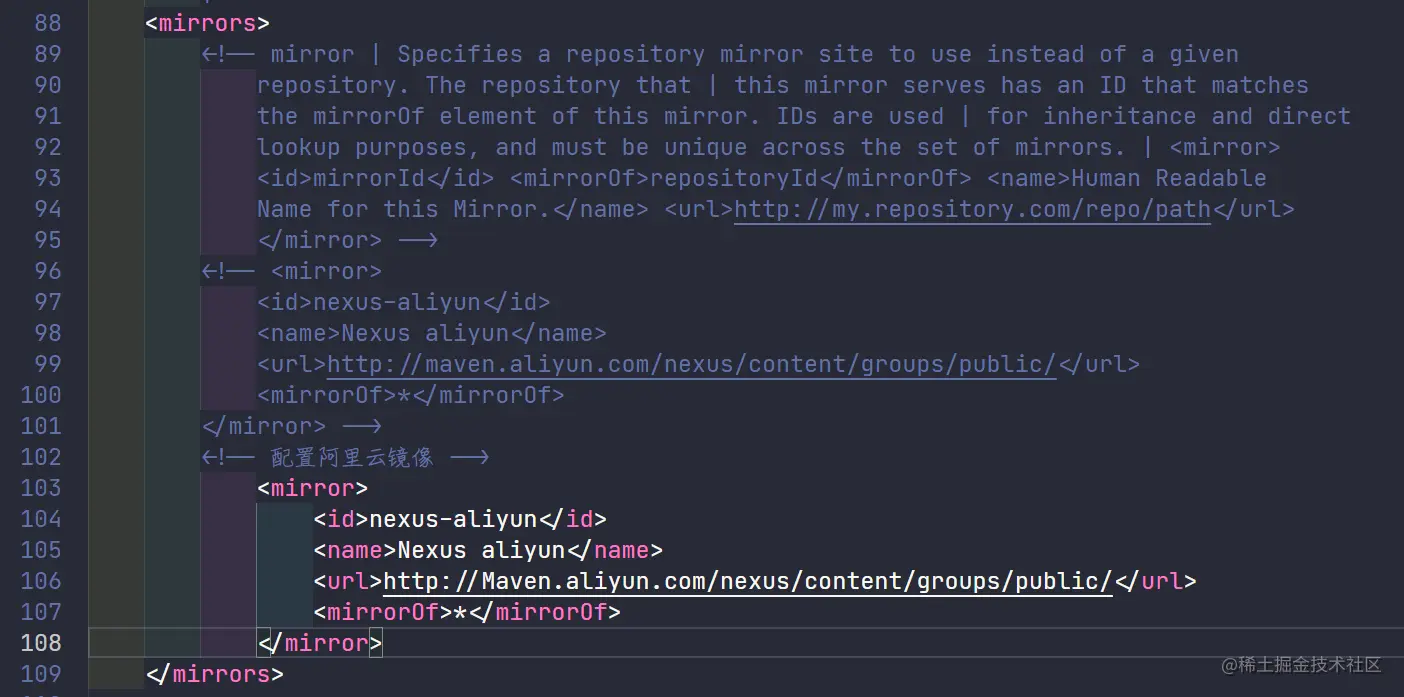 在 根目录\conf\setting.xml 文件的 mirrors节点里 添加以下代码(更改为阿里云Macen仓库)