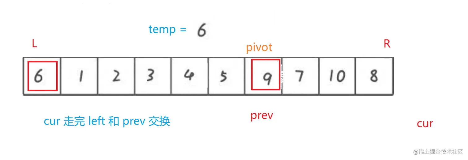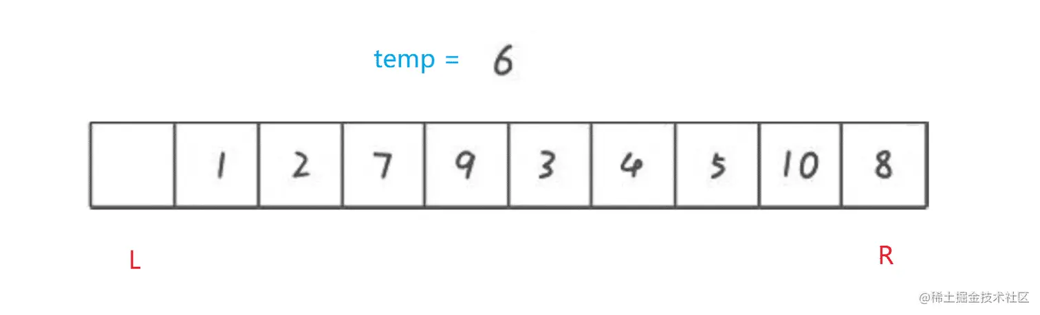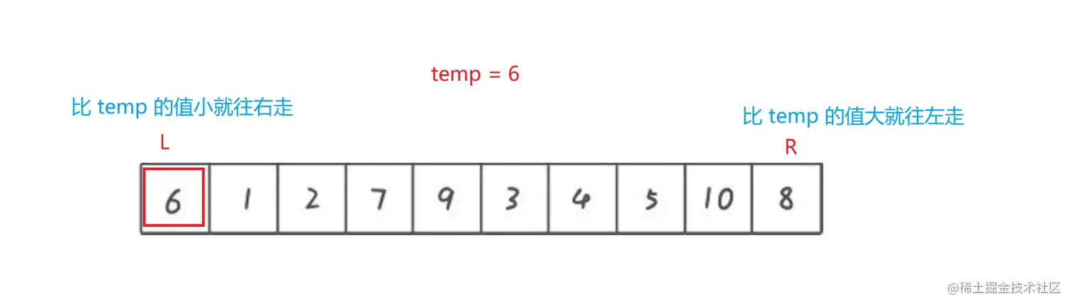 - 同理, 左边遇到比 temp 中的值小的就往右走, 遇到比 temp 中的值大就放入前面挖的坑中, 直到 left 和 right 相遇