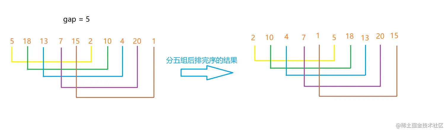 gap相同的数分在同一组内,并对每一组内的数据进行直接插入排序。然后重复上述分组排序的工作, 当gap = 1时,对整体进行了一次插入排序