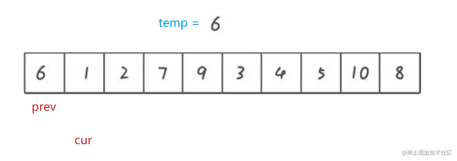 - 从右或左开始走, 右边遇到比 temp 中的值大的就往左走, 遇到比 temp 中的值小就放入前面第一次挖的坑中