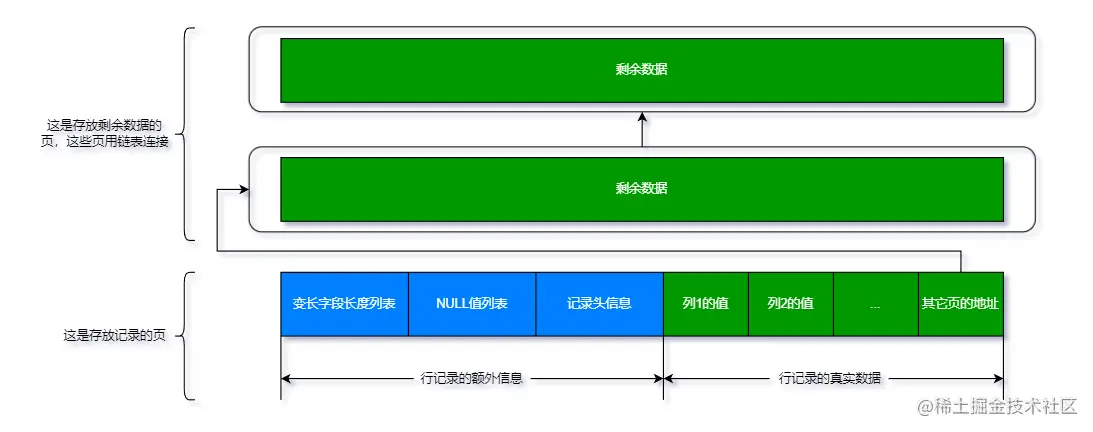 每页至少需要存2条记录。则有如下不等式:132 + 2 * (27 + n) < 16KB。解出n < 8099。当这列中存储的数据占用空间>=8099字节时,就会成为溢出列。