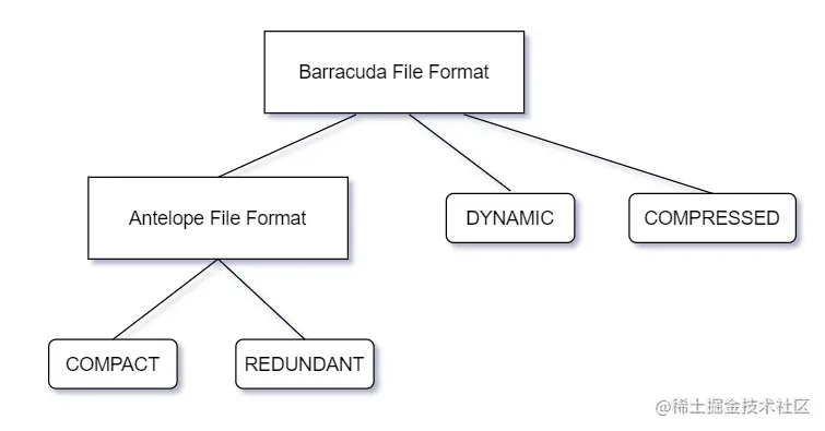 InnoDB1.0.x版本的文件格式定义为Barracuda,之前的版本定义为Antelope。Barracuda文件格式包含了Antelope文件格式,并引入了DYNAMIC,COMPRESSED两种行格式。如下图所示。