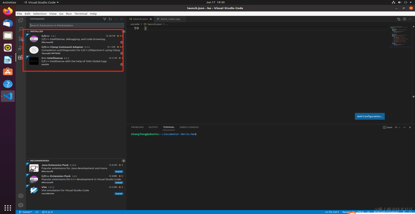 - 打开 vscode,并打开 be 源码所在目录,在本案例中打开目录为 /home/workspace/incubator-doris/