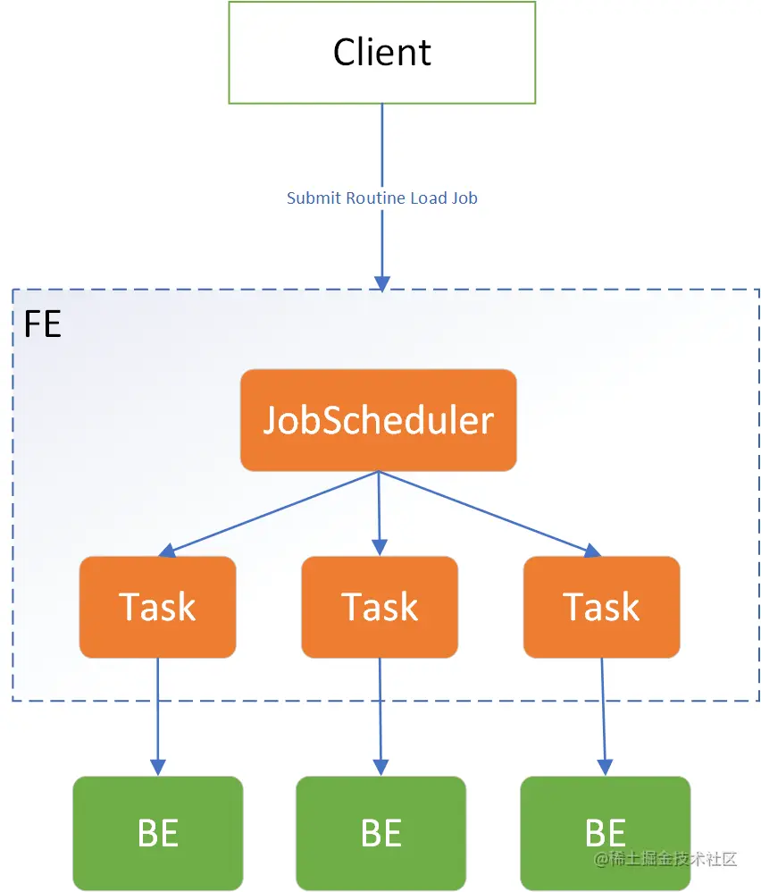 FE 通过 JobScheduler 将一个导入作业拆分成若干个 Task(一般是和Kafka的Partition数量一致)。每个 Task 负责导入指定的一部分数据。Task 被 TaskScheduler 分配到指定的 BE 上执行。