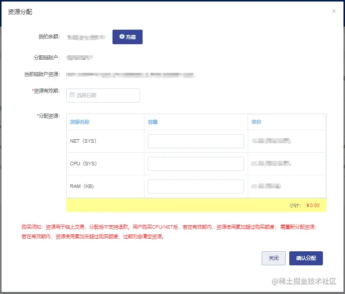 注意:资源用于链上交易,分配后不支持退款。链上交易处理过程中,从链账户中扣除资源时,链账户上必须同时有NET、CPU和RAM,三种资源缺一不可。CPU/NET购买后,资源使用有时间限制,RAM购买后无时间限制。用户购买CPU/NET后,若在有效期内,资源使用累加超过购买额度,需重新分配资源,否则过期则会清空资源。