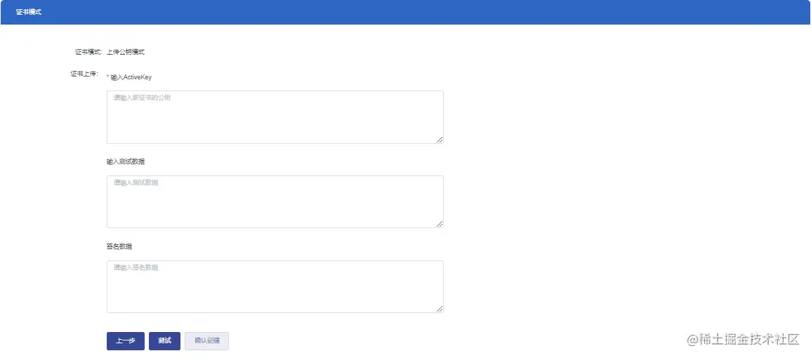 1.3 用户点击【创建】按钮,进入证书模式页中,输入公钥、测试数据及签名数据。测试通过后,点击【确认创建】完成链账户创建;