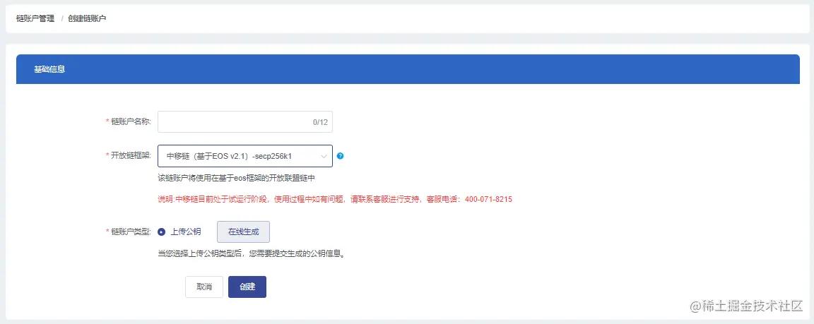 1.2 在链账户模块中点击创建链账户进入新增页面。页面中输入链账户名称,开放链框架下拉中选择中移链,链账户类型只支持上传公钥模式;
