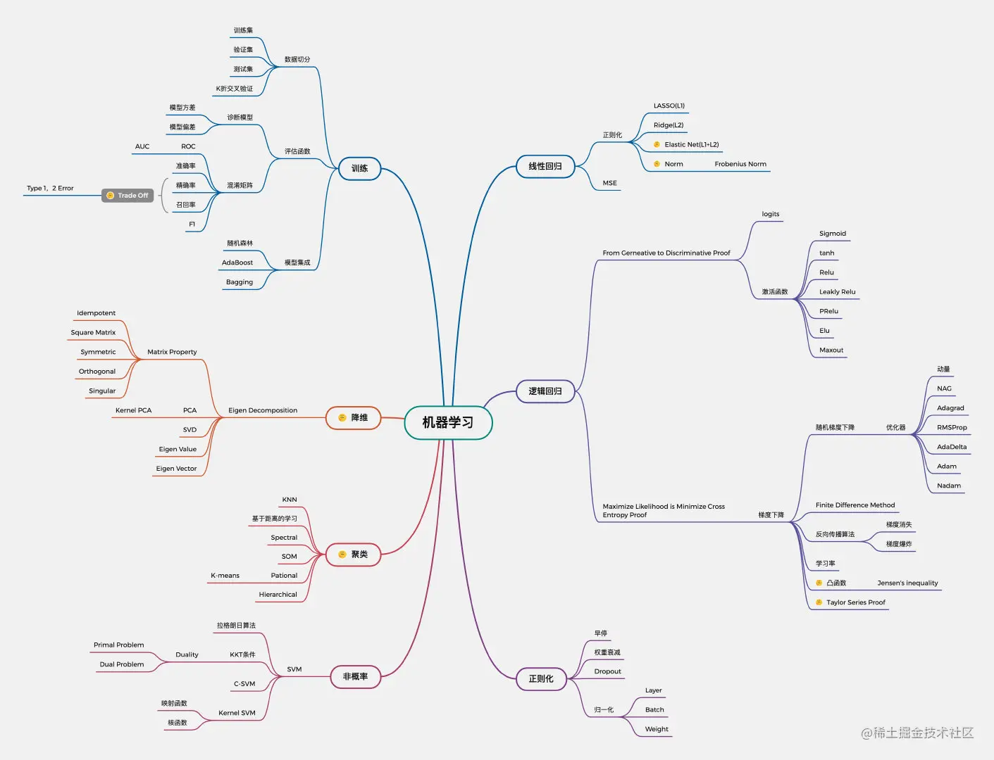 机器学习算法也是NLP的基石,含有许多基础概念,图中分为训练、降维、聚类、非概率、线性回归、逻辑回归、正则化七部分。笔者知识体系在“降维、聚类”存在缺漏,将在后面对该部分内容展开学习。