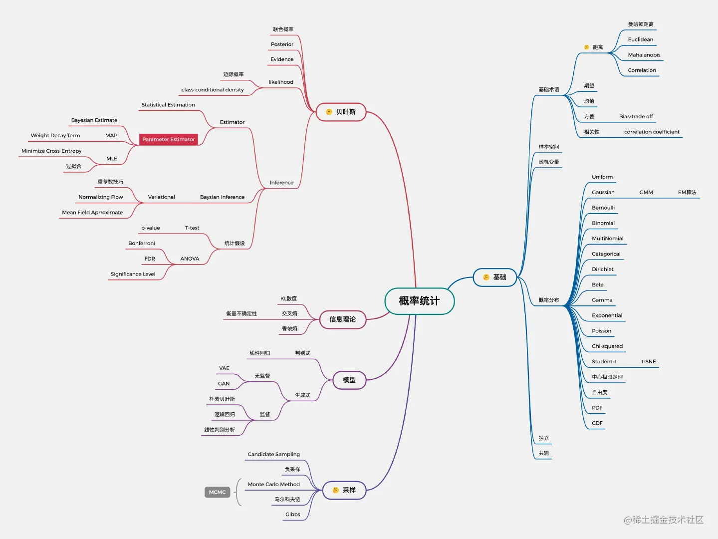 概率统计是人工智能算法的基础,图中分为贝叶斯、信息理论、模型、采样、基础五部分。笔者知识体系在“基础、采样、贝叶斯部分”存在缺漏,将在后面对该部分内容展开学习。