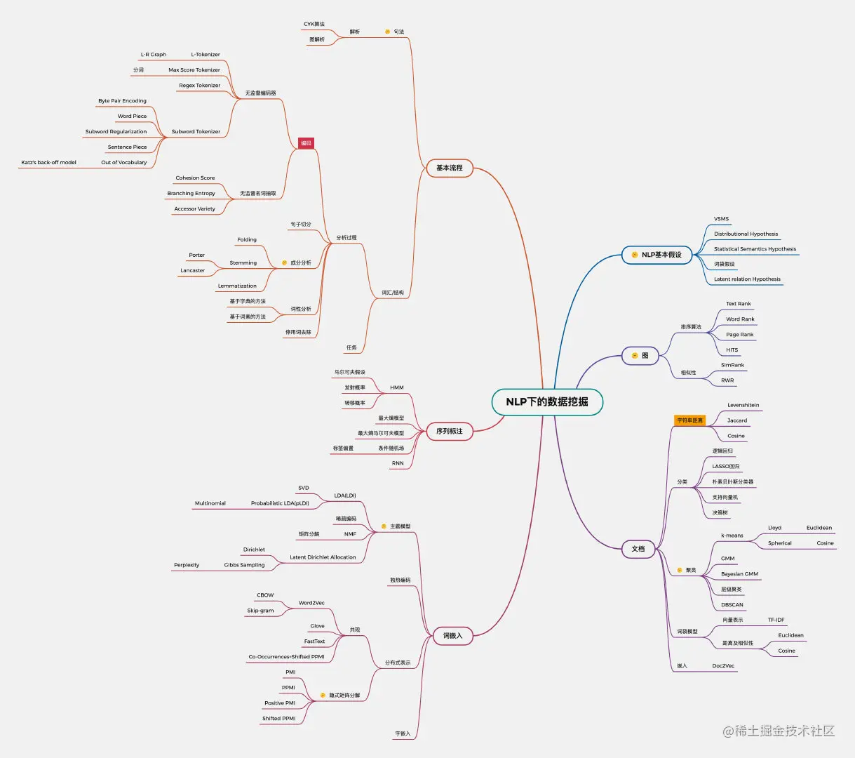 NLP下的数据挖掘包含常见NLP数据处理操作,图中分为基础流程、序列标注、词嵌入、NLP基本假设、图、文档六部分。笔者知识体系在“主题模型、NLP基本假设、图”存在缺漏,将在后面对该部分内容展开学习。