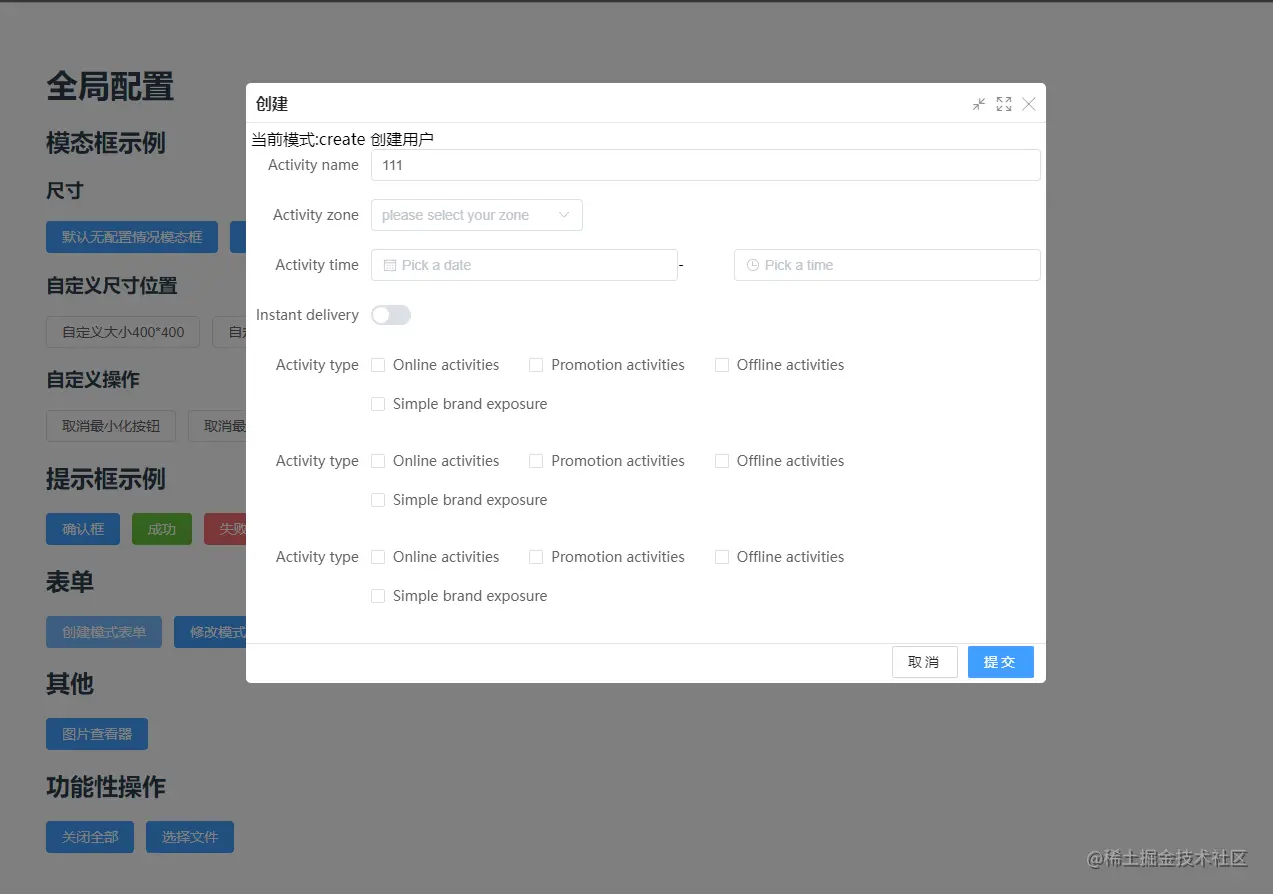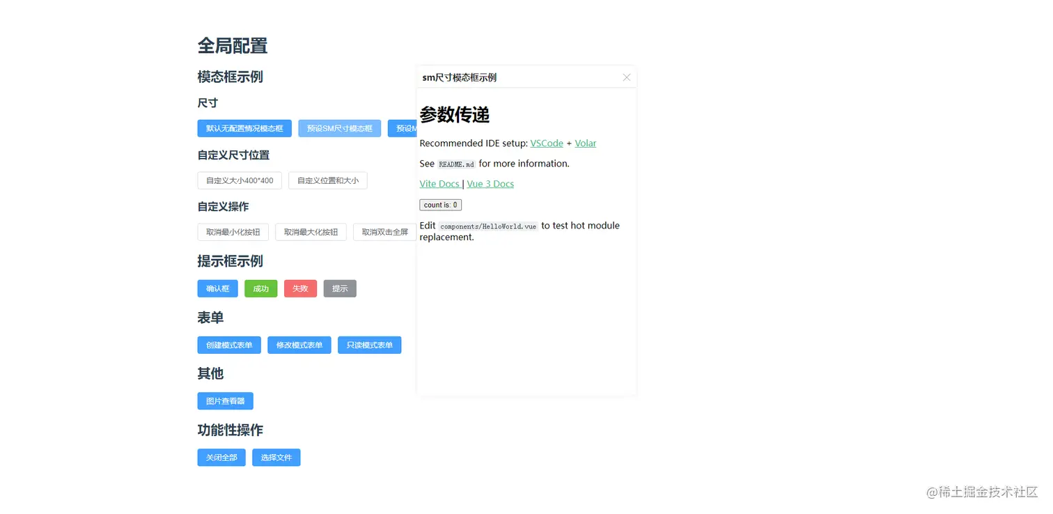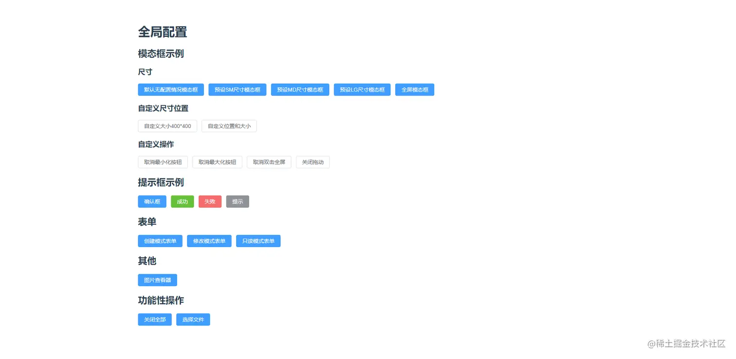预设sm|md|lg等多种尺寸弹出框,简化使用时代码,尺寸配置支持几乎所有类型的弹出框包括表单