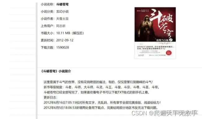 加下来我们找找文件在哪里下载,我们继续点击斗破苍穹来到下面的页面,为啥选择斗破这本小说,那是因为这个是up人生中第一本看完结的小说,也是印象最为深刻的小说。不知道大家有没有同感的,记得那时候等更新可是很难等的。
