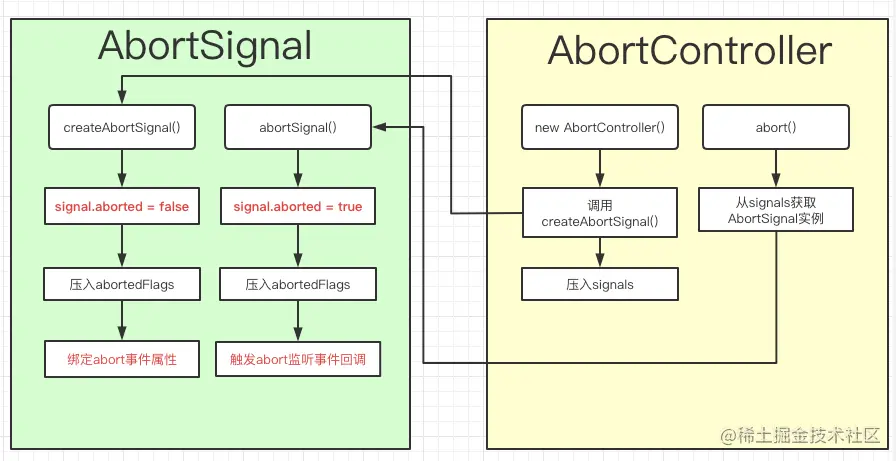 AbortController由两部分构成:abort-signal和abort-controller,架构图如下: