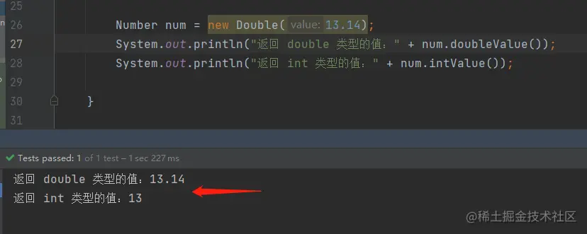 对于抽象类而言,不能直接被实例化,要实例化其具体的子类才行。但子类等可以使用父类的所有方法。而且为Number的子类有提供将表示的数值转换为对于基础数据类型的方法,共有6个,比如对于int ,有intValue()方法,返回一个int类型的值,再比如double Double(),返回一个double类型的数值类型。代码演示: