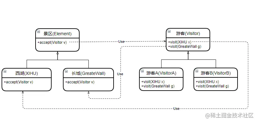 例如我们定义景区是一个元素类,西湖、长城是一个具体的元素类,游客就是访问者的抽象,那么游客A、游客B就是具体的访问者。