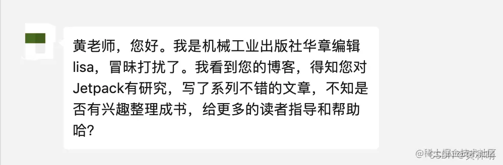 一次偶然的机会,机械工业出版社的编辑Lisa老师联系到我,问我是否有兴趣出版一本关于Jetpack的书籍。