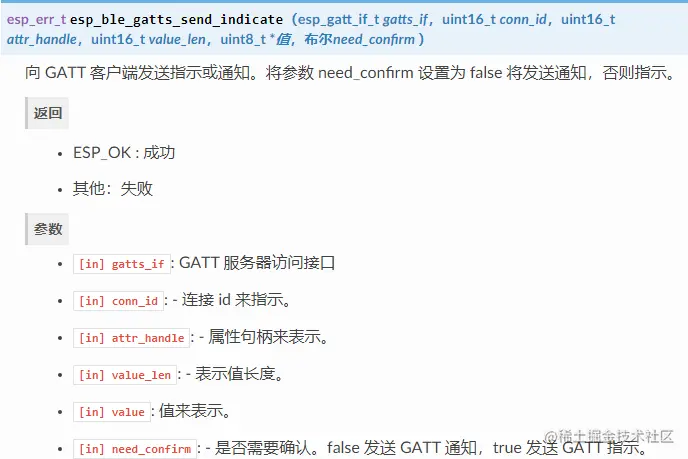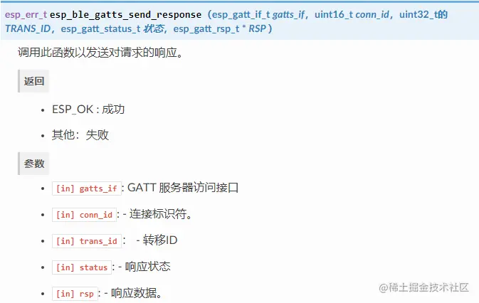以下 GATT 接口位于 bt/host/bluedroid/api/include/api/esp_bt_main.h 和 bt/host/bluedroid/api/include/api/esp_gatts_api.h。
