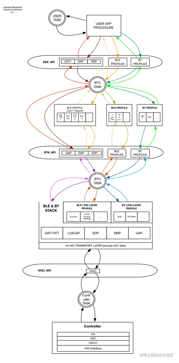 在 ESP-IDF 中,使用经过大量修改后的 BLUEDROID 作为蓝牙主机 (Classic BT + BLE)。BLUEDROID 拥有较为完善的功能,⽀持常用的规范和架构设计,同时也较为复杂。经过大量修改后,BLUEDROID 保留了大多数 BTA 层以下的代码,几乎完全删去了 BTIF 层的代码,使用了较为精简的 BTC 层作为内置规范及 Misc 控制层。修改后的 BLUEDROID 及其与控制器之间的关系如下图: