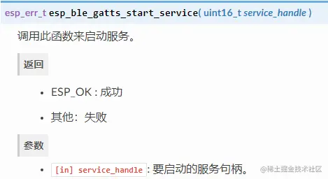 此示例使用此事件打印信息并检查创建的表的大小是否等于枚举 HRS_IDX_NB 中的元素数。如果表创建正确,则将属性句柄复制到句柄表 heart_rate_handle_table 中,并使用以下esp_ble_gatts_start_service()函数启动服务: