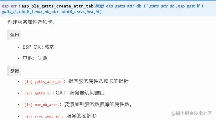 创建属性表时,ESP_GATTS_CREAT_ATTR_TAB_EVT会触发一个事件。此事件具有以下参数: