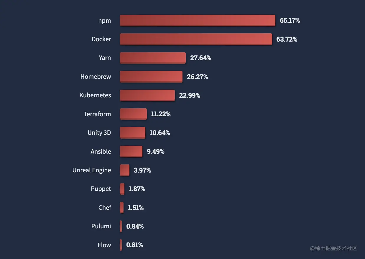 npm 和 Docker 是开发人员使用最多的工具,yarn 紧随其后。