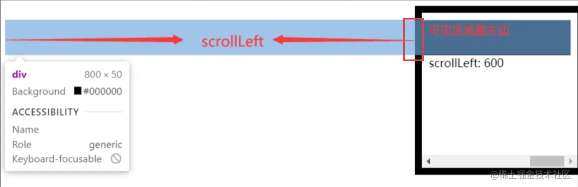 scrollLeft 的数值就是已经滑动、消失的部分和当前可见区域最左边的距离