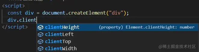 JS 基于 DOM 对象可以拿到元素的宽高的属性有 offset 系、scroll 系、client 系(以其名称作为前缀得名),IDE 提示如下(以 VS Code 为准)