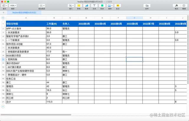 以下,是我曾经用Mac苹果的Numbers(相当于微软的Excel表格)手动整理的真实项目甘特图。