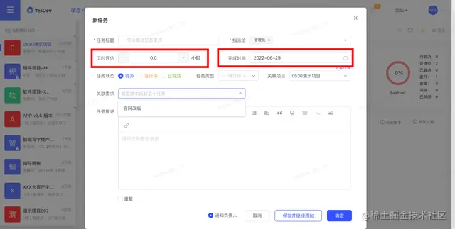第1步,在使用YesDev协同工具时,为了能汇总甘特图,我们需要每位项目成员先根据需求拆解开发任务和评估工时,同时关联到对应的需求。