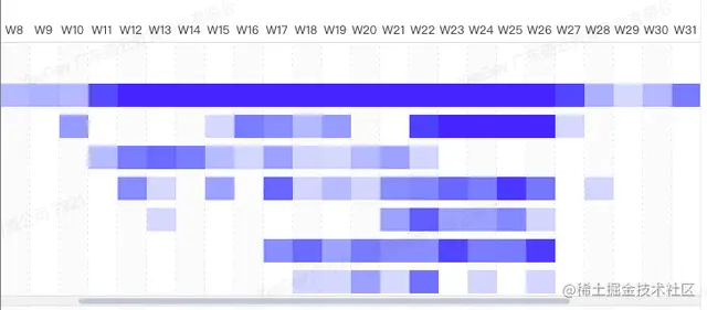 由于项目周期长,并且工时过大,为此我们需要选择的视角是让甘特图按人天、按周为划分单位,先来宏观感受一下项目甘特图。结合下图,可以明显看到,在项目启动的前期和后期,工程量是不多的,更多工作量是集中在中部,这也是符合我们的常识。