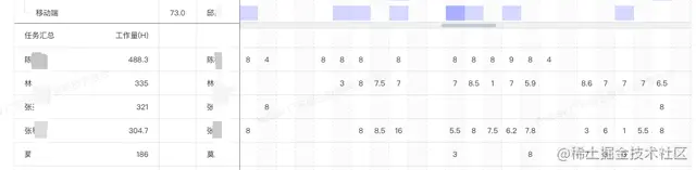 接下来,在人员的工时上,我们要注意并要学会看懂这些数字。基本上,每个人每天的工作时间是8H,如果哪个人的一天工时远超过8H,则说明要么他没有精确进行工时计划,要么他极有可能存在延期的风险。反过来,如果团队很多成员的工时都不满每天8小时,而团队又推辞说这个项目无法按时上线的话,那么作为项目负责人,你应该学会用数字说话。