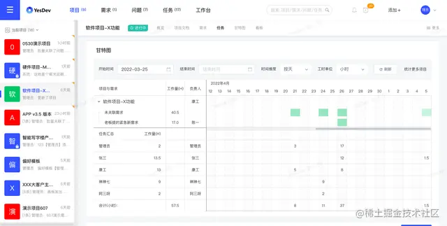 这样,你和你的团队就可以看到当前项目的实时甘特图了。可以看到,甘特图支持:按天、按周、按月进行汇总,同时可以按人天或按小时统计工时。在上半部分,以需求以事汇总工时和计划;在下半部分,以人为单位汇总工作量。