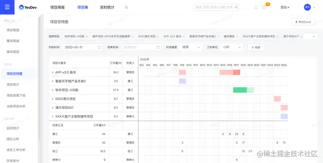 点击【统计更多项目】,进入项目集的甘特图,我们还可以自由选择多个项目。每个项目可以下钻到需求,也可以折叠成项目。每个项目的甘特图颜色也是可以自定义的。统计的时间范围和维度也可以自由选择。最后,还能导出Excel文件。