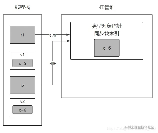 由图中可知,由于r1和r2是引用类型,同时引用托管堆上同一块内存,所以其中一个变量改变x的值,另一个也会受影响。而v1和v2是值类型,在v2=v1时,其实是进行一次数据拷贝,两个变量分别对应两个对象,所以其中一个修改也不会影响另一个