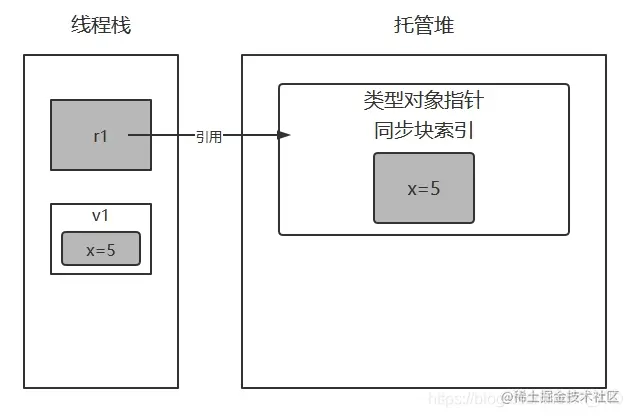 - 此时的内存分配情况,可以见到r1只是变量在栈上,而实际引用的值在堆上。而v1值直接存储在栈上
