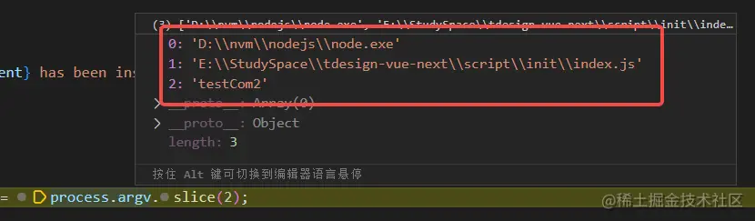 获取要创建或者删除的组件名以及是否删除,process.argv是一个数组,第一元素为nodejs的路径,第二个元素为当前js文件的路径,第三个元素为参数,如下图所示: