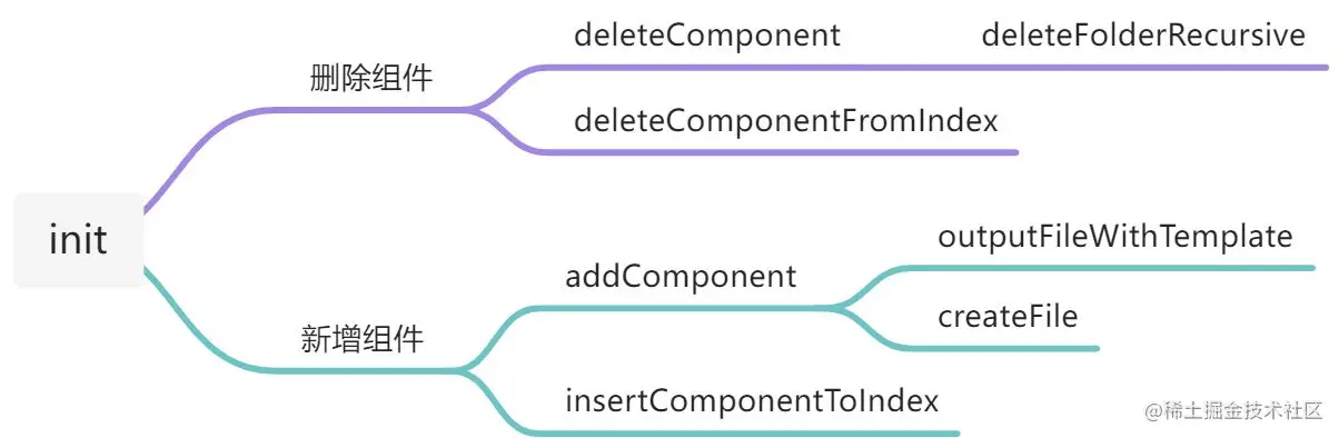 执行npm run init时,会执行tdesign-vue-next/script/init/index.js 中的init方法,init方法中的核心逻辑是参数检查、获取目标文件、添加或者删除文件。通过一张导图概览其核心内容: