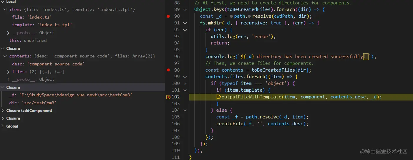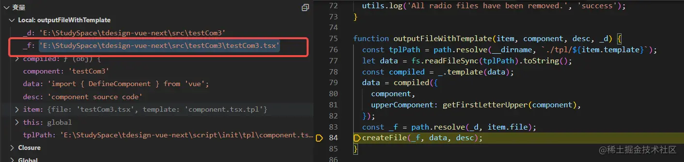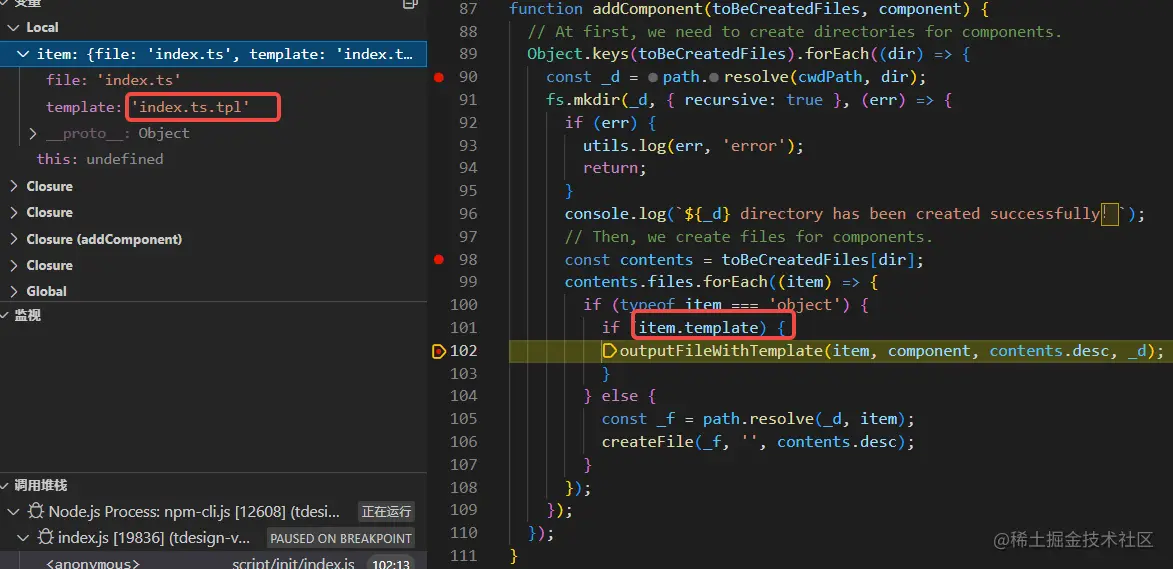 tplPath是获取模板文件目录,通过fs.readFileSync获取模板文件内容,这里还使用到了lodash的template方法创建模板编译函数compiled,compiled可以把模板中的内同替换为对应的参数。最后调用createFile方法创建文件。outputFileWithTemplate方法的调试过程如下图所示: