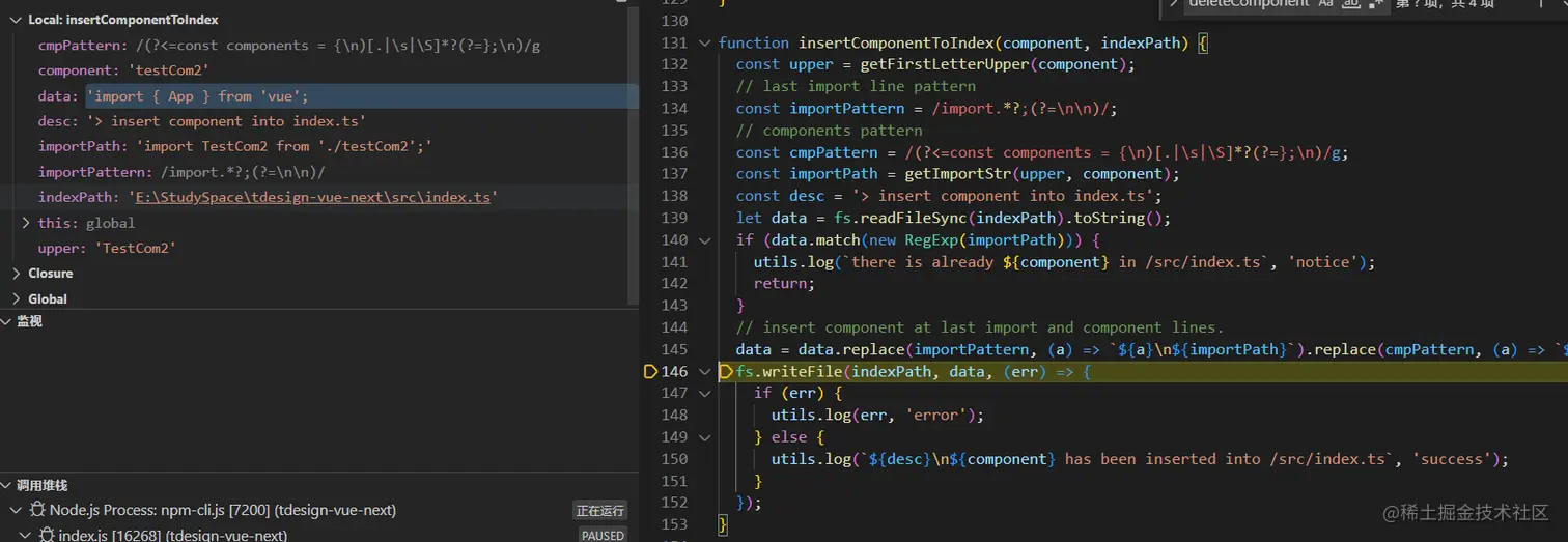 getFirstLetterUpper是将组件名的首字母转成大写,getImportStr是获取引入组件的import语句,调用fs.readFileSync方法读取index.ts文件的内容。然后使用字符串的match方法检查是否已经导入过新创建的组件了,如果没有导入过则使用replace方法对原来的内容进行替换。最后使用 fs.writeFile方法将内容写入文件。