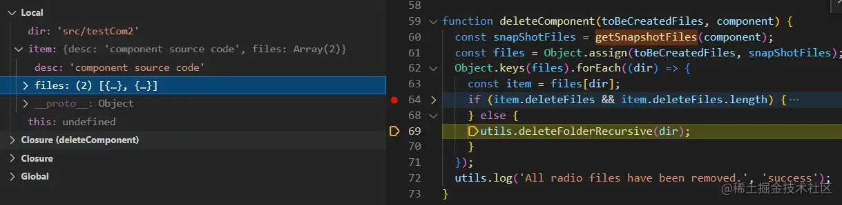 删除文件的时候要把执行单元测试生成的文件也删除,所以调用了getSnapshotFiles方法;fs.existsSync(f)用于判断路径是否存在,fs.unlinkSync(f)用于删除文件。在调试的可以发现由于item上不存在deleteFiles属性则会调用deleteFolderRecursive方法, 此方法用于递归删除目录下的文件。