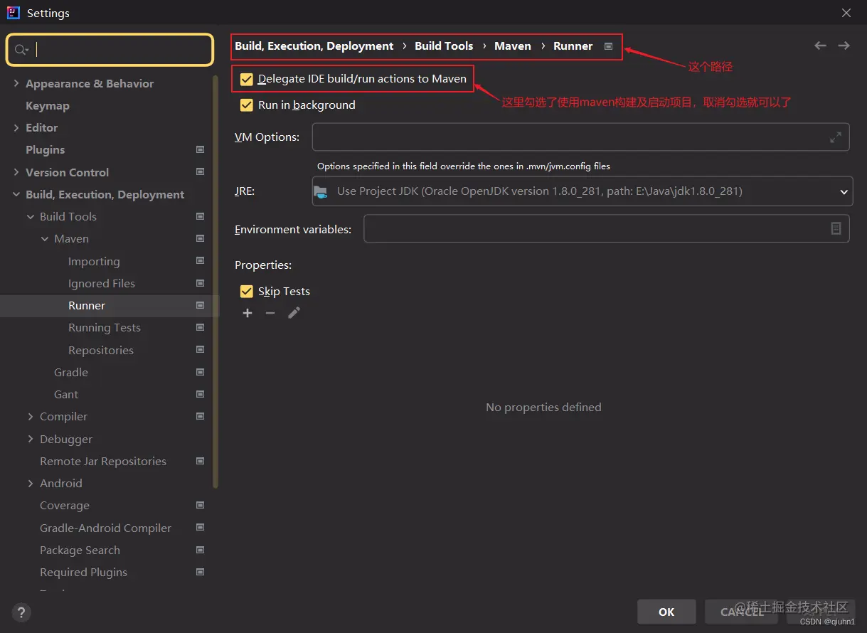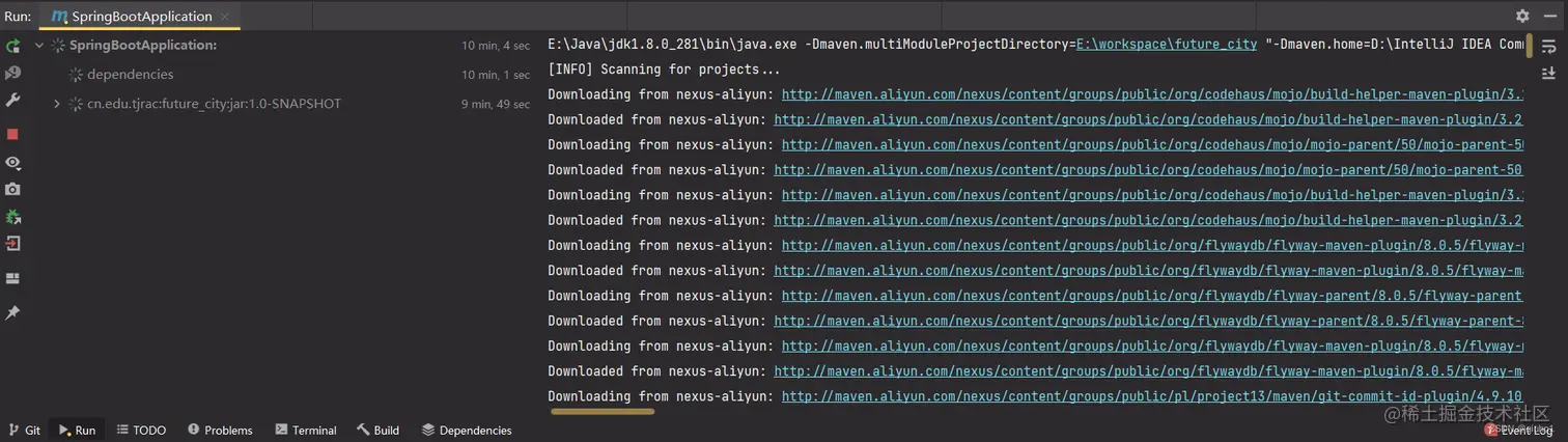 IDEA设置不使用maven构建及启动项目 Cjoadvear 2022-06-26 343 阅读1分钟 前言 今天使用IDEA启动SpringBoot项目时突然发现和往常不太一样,仔细观察发现在启动时是经过maven进行build后才启动的服务。 主要特征 较为明显的控制台差异 第一次启动安装了一遍依赖 然后进行了一次build 启动成功后中文全部显示乱码 解决方案 左上角File->Settings 效果展示 运行成功,没有问题~